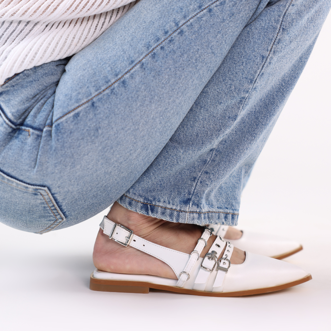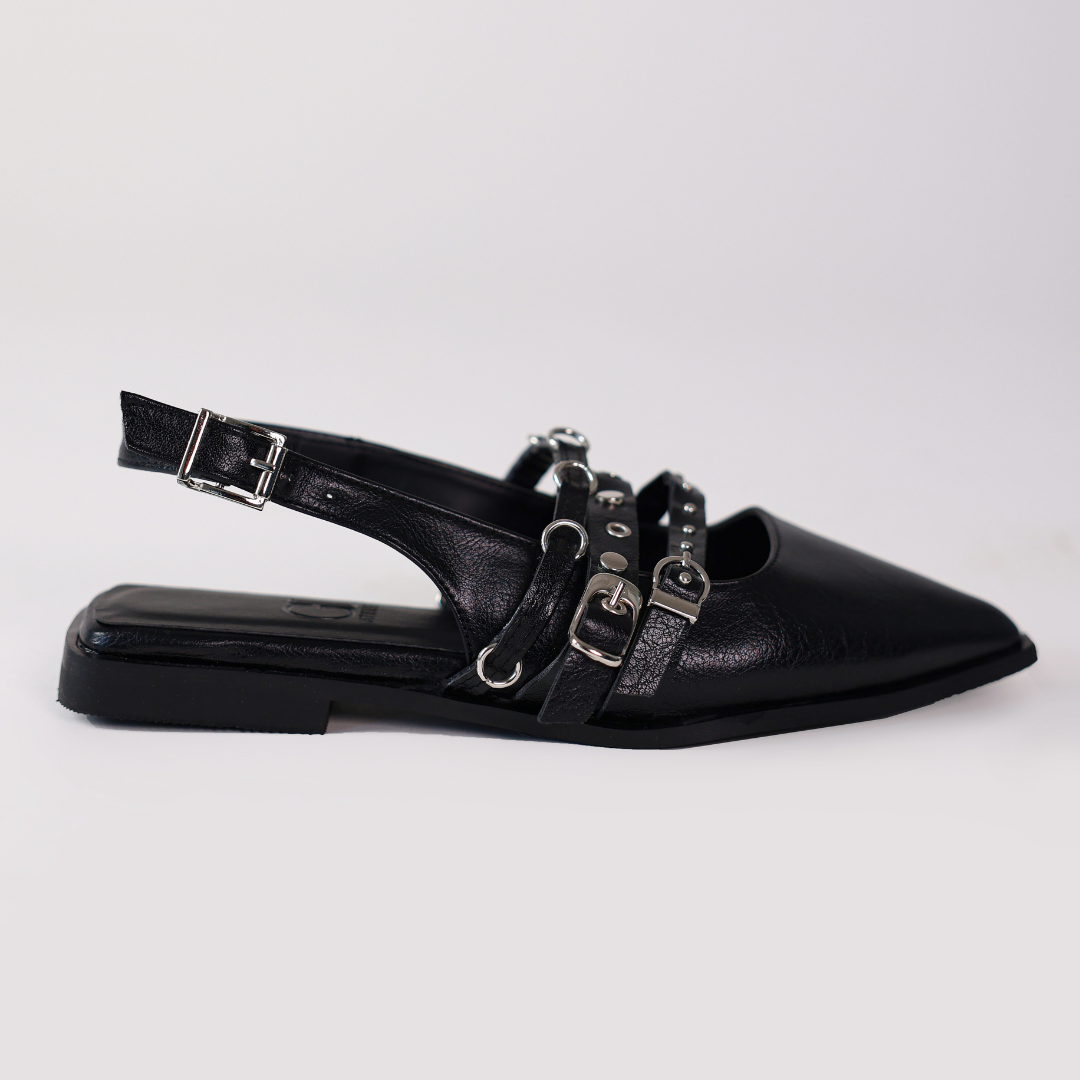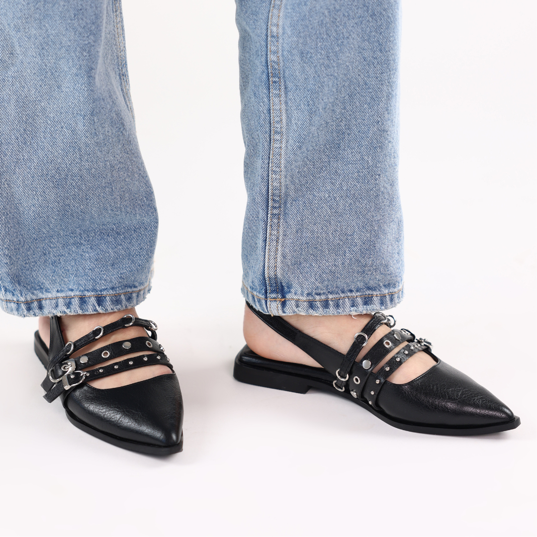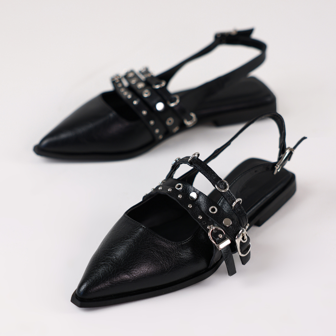 Crafted in smooth leather with striking metal accents, the Elira Buckle Flats are the perfect fusion of bold style and everyday ease. Featuring a sharp pointed toe and multiple statement straps with polished silver buckles, Elira brings rebellious charm to a classic slingback silhouette. The secure ankle strap ensures comfort with every step, while the flat sole makes them ideal for all-day wear. Whether paired with denim or tailored pieces, Elira adds attitude and edge to any outfit.
