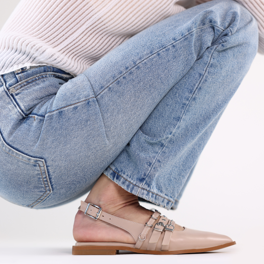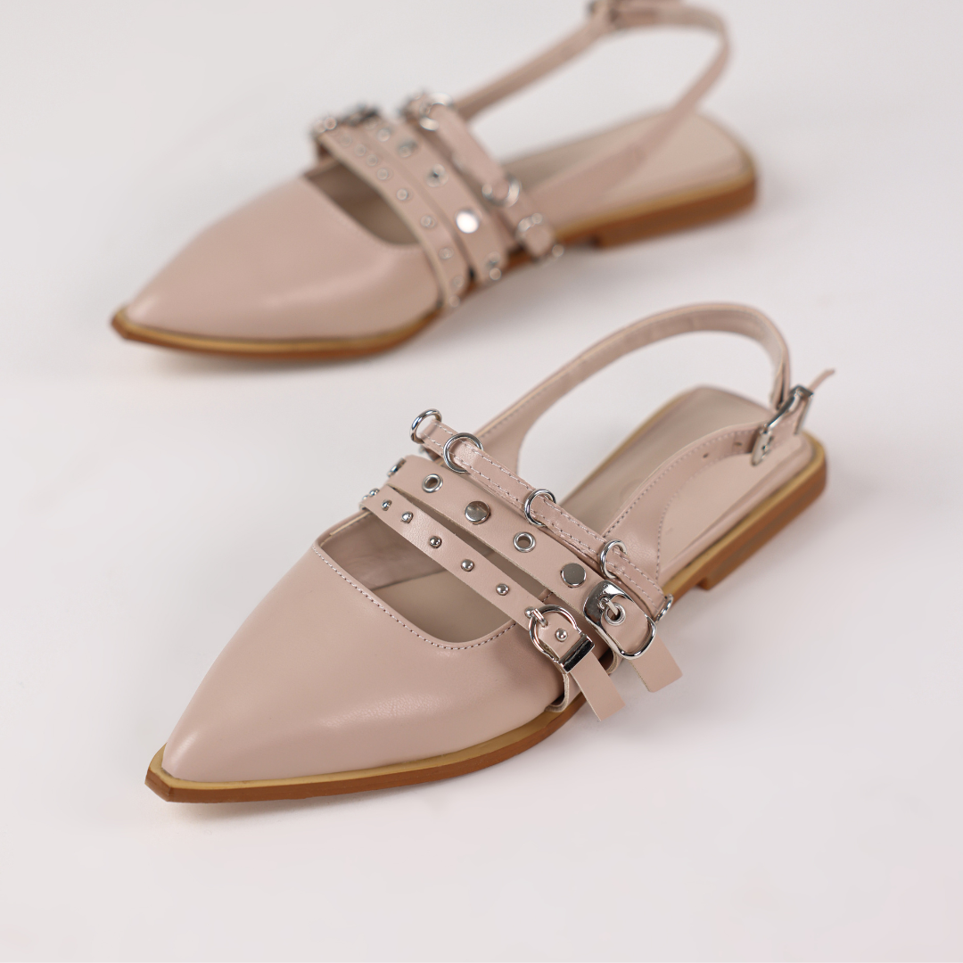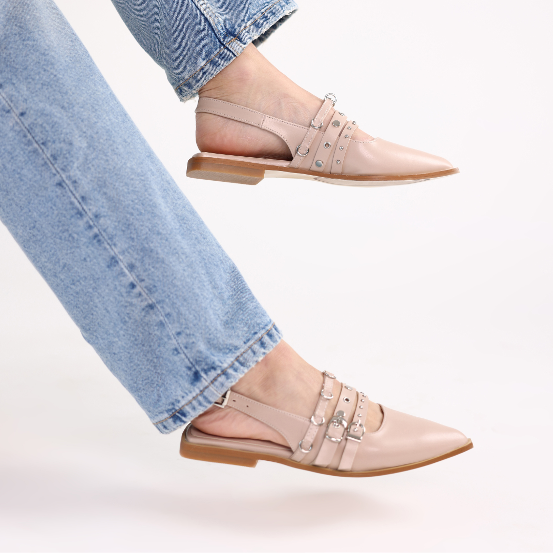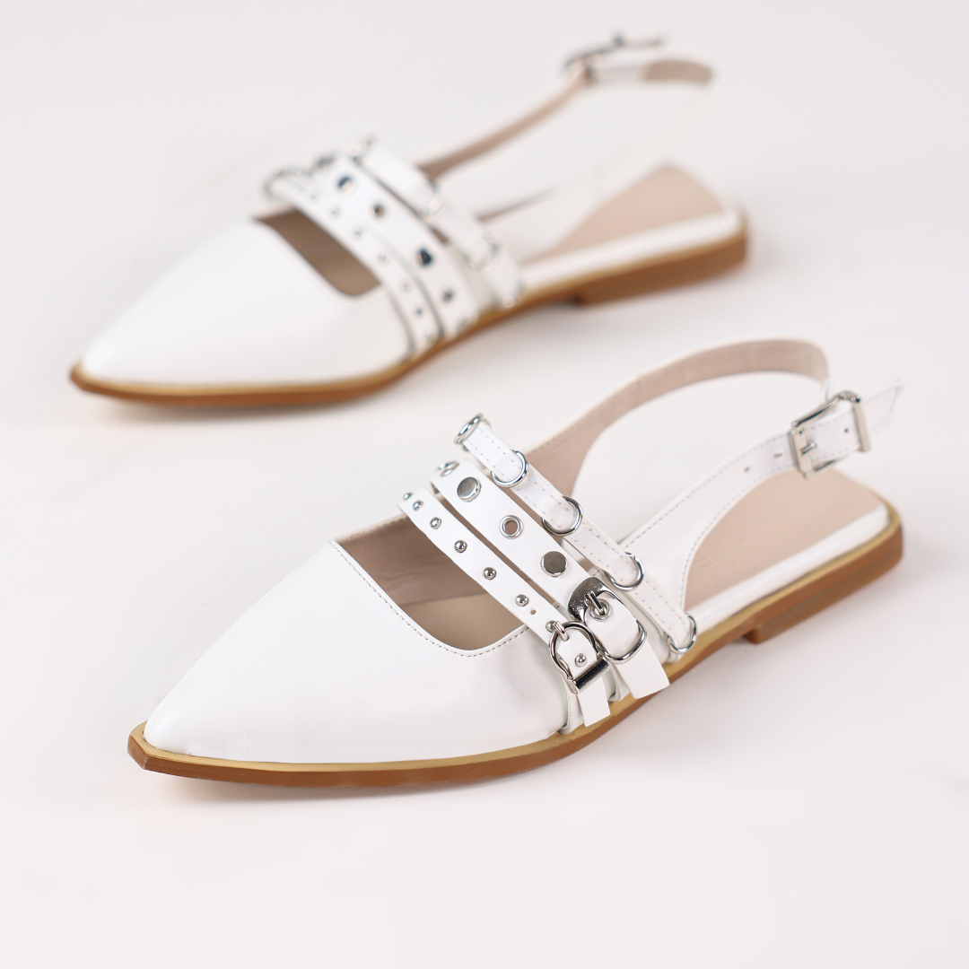 Crafted in smooth leather with striking metal accents, the Elira Buckle Flats are the perfect fusion of bold style and everyday ease. Featuring a sharp pointed toe and multiple statement straps with polished silver buckles, Elira brings rebellious charm to a classic slingback silhouette. The secure ankle strap ensures comfort with every step, while the flat sole makes them ideal for all-day wear. Whether paired with denim or tailored pieces, Elira adds attitude and edge to any outfit.