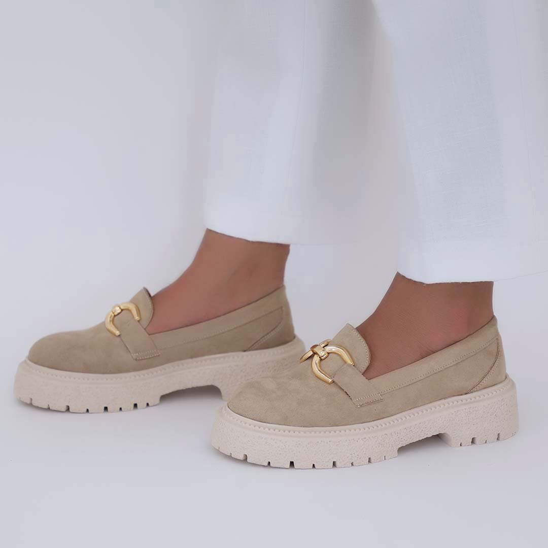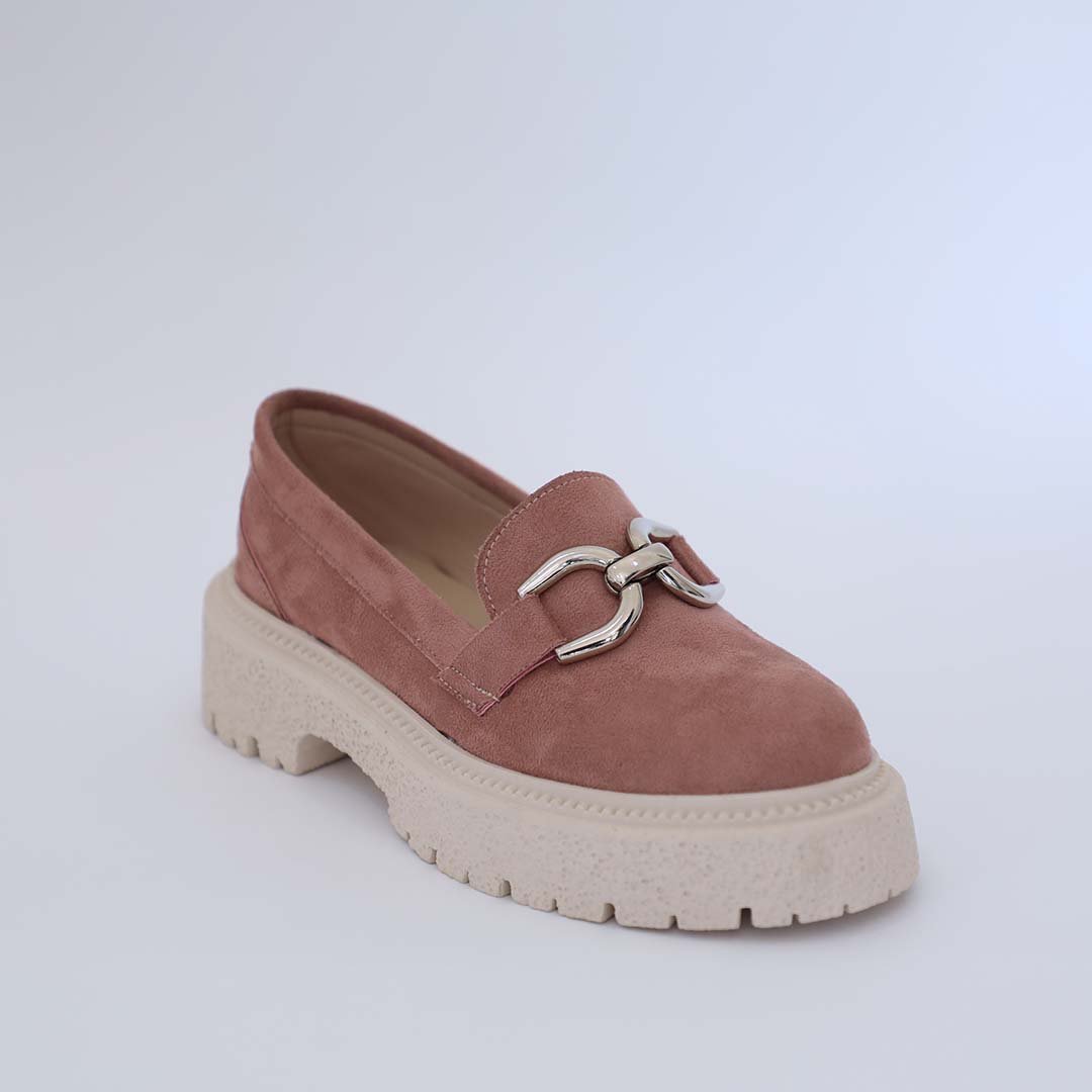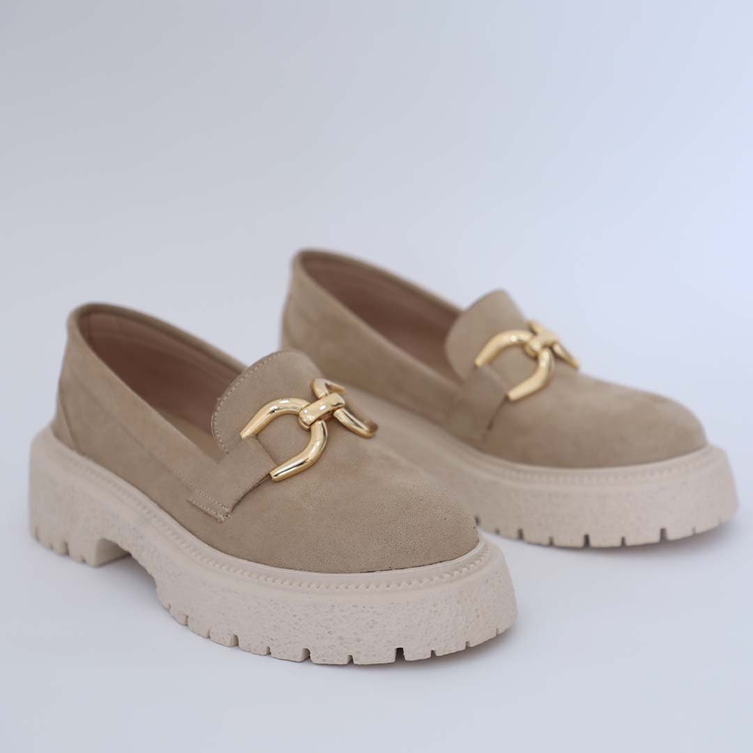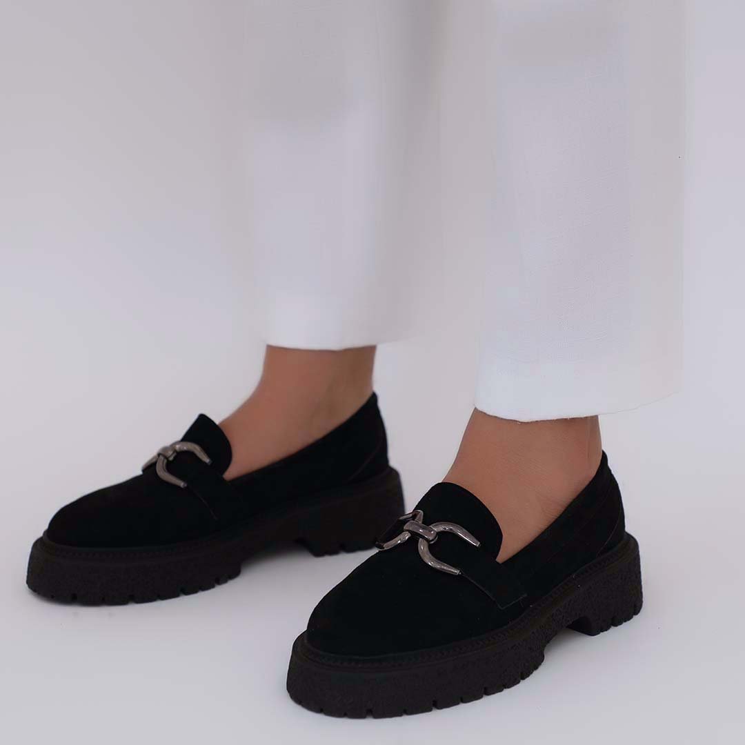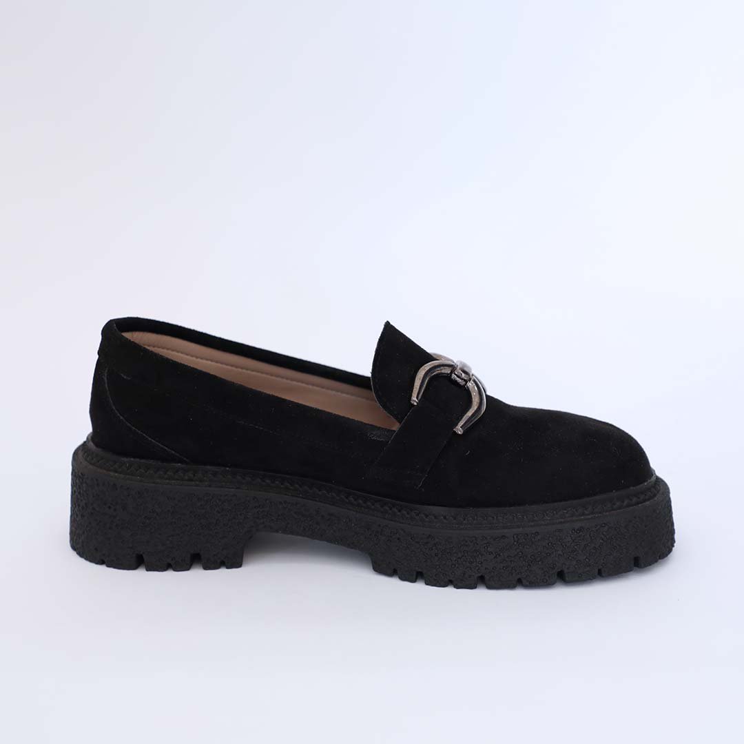 Made with suede, chain detail, and chunky track sole.