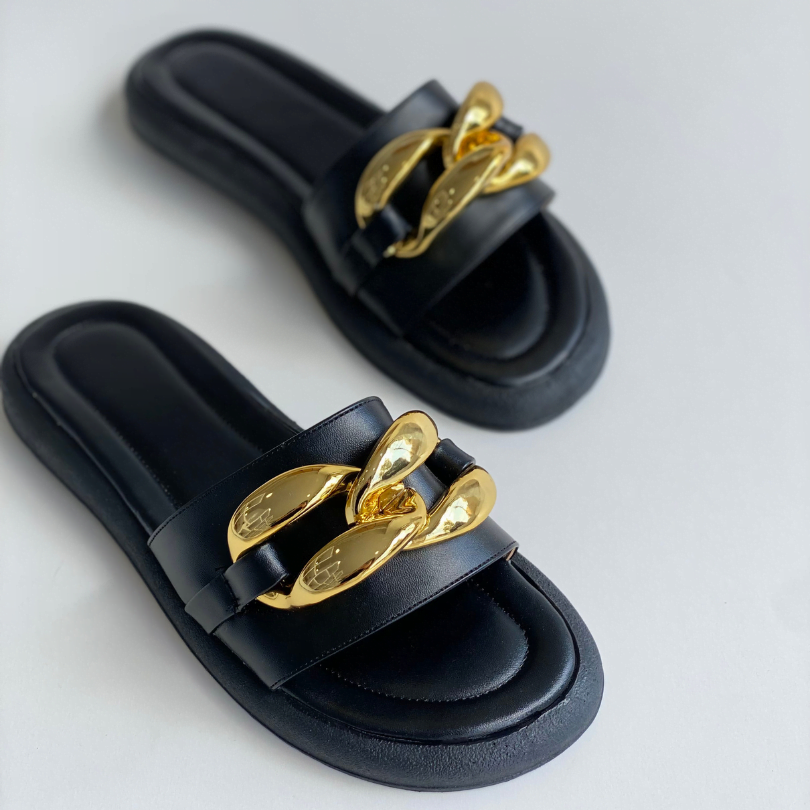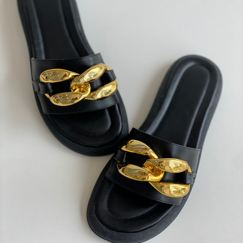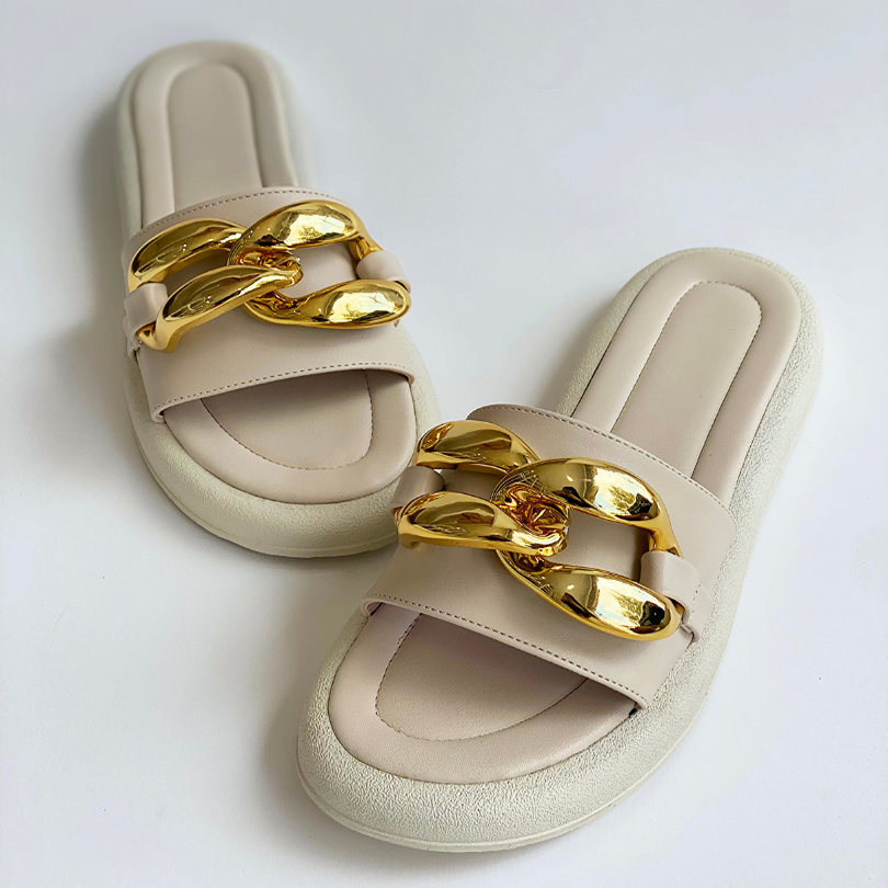 Elegant summer slides, featuring a gold chain. The perfect blend of comfort and style for every occasion.