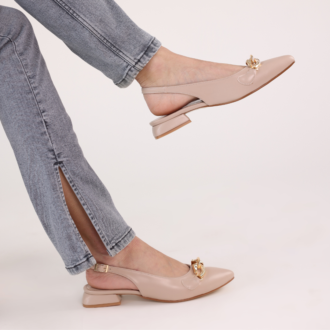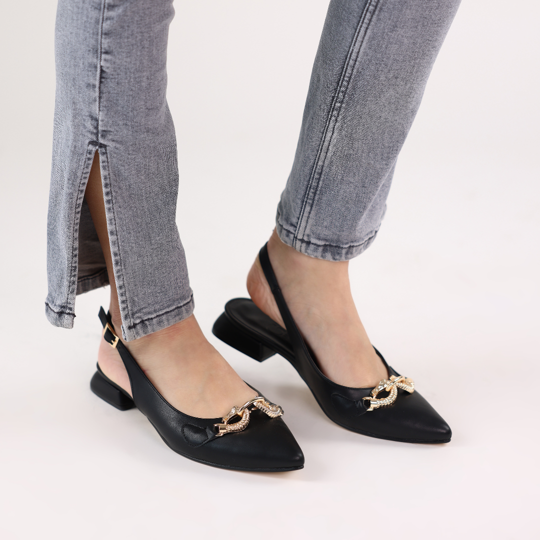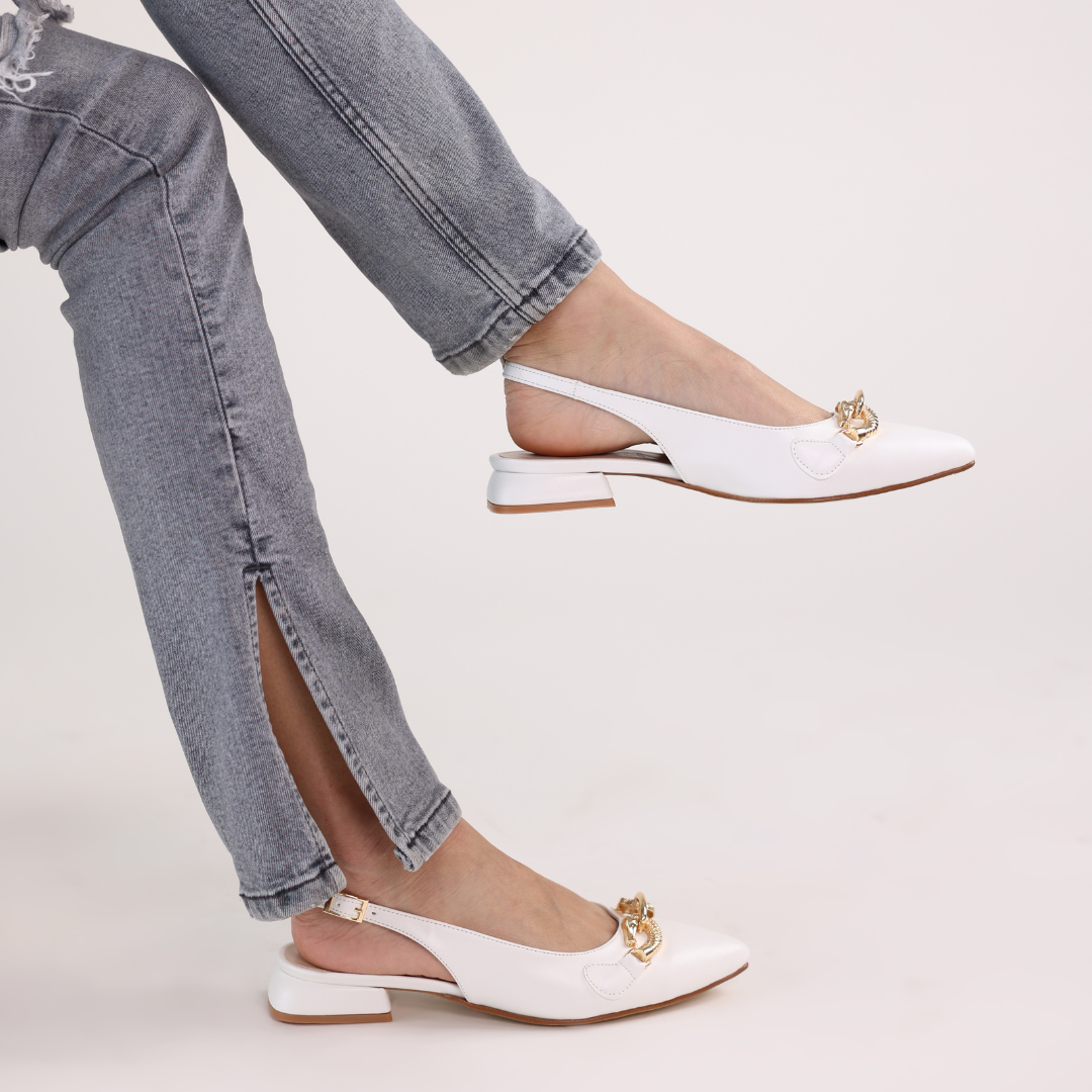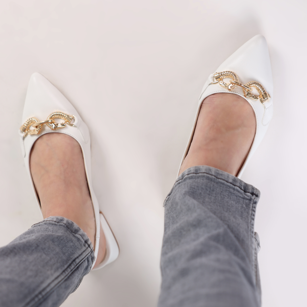 Crafted in smooth leather and finished with a sculptural gold chain detail, the Orla Slingbacks bring modern elegance to everyday dressing. Designed with a pointed toe and a sleek slingback silhouette, Orla features a comfortable 2 cm heel that adds just the right lift. The bold gold hardware brings a refined edge, making it the perfect piece to dress up or down. From office days to evening plans, Orla steps up any outfit with ease.